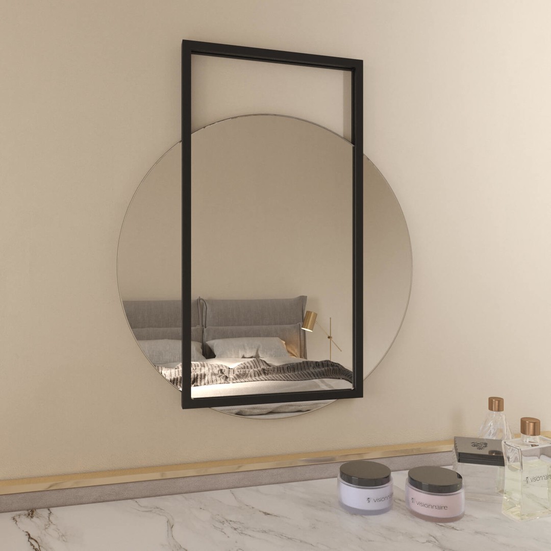 Зеркало «Terraform». Артикул GMZ-07-1/2/3 Эксклюзивное настенное зеркало, которое благодаря своей оригинальной форме идеально подходит для интерьеров, выполненных в современных стилях: хайтек, минимализм, скандинавский, авангардный, лофт, контемпорари. Зеркало круглое, вставлено в промежуток внутри прямоугольной рамы большего размера и выглядит очень эффектно. Рама металлическая надёжная покрыта матовой эмалью, а само зеркальное полотно производства известного бельгийского бренда AGC отличается безупречным качеством. На обратной стороне конструкции имеются специальные приспособления для крепления к стене.Характеристики:– габаритные размеры рамы – 890х740 мм, профиль – 15х15 мм; – диаметр зеркального полотна – 740 мм, толщина – 4 мм; – устойчивая матовая порошковая окраска; – цвета – золотой, чёрный, белый; – саморезы для крепления к стене в комплекте; – вес – 7 кг; – гарантия – 1 год.